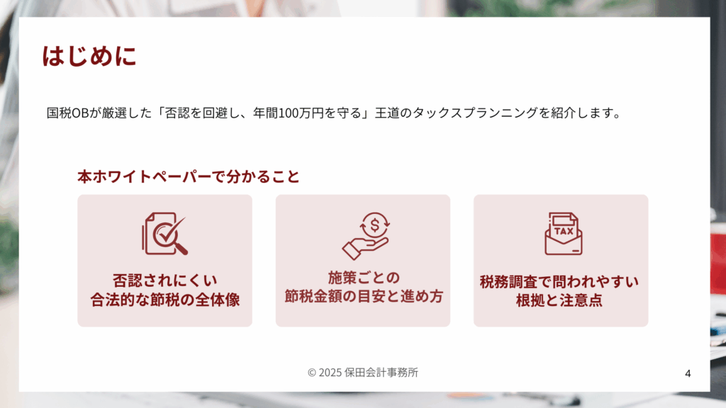 本資料では、国税OBが厳選した“王道のタックスプランニング”を、具体策10選として整理しました。